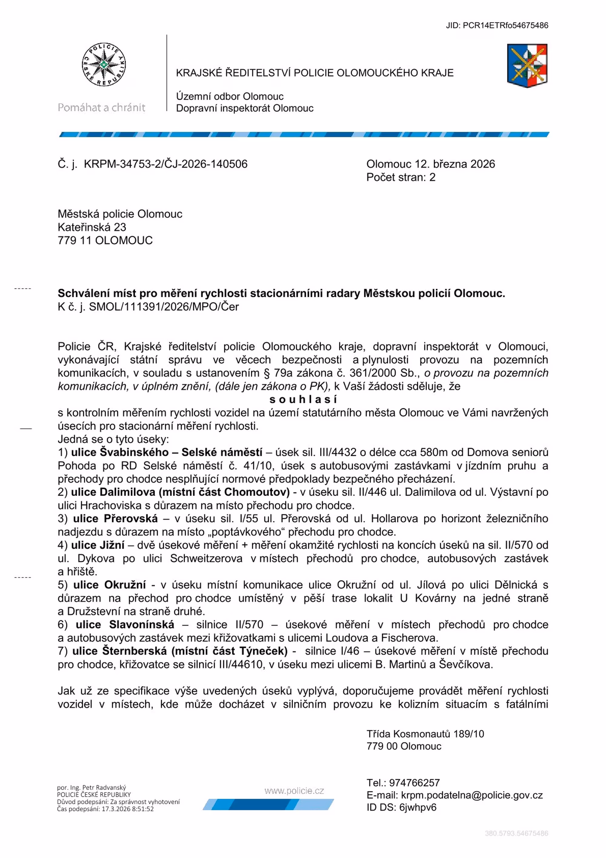 - ul. Šternberská, silnice I/46 – v místě přechodu pro chodce, napojení silnice III/44610 ulice B. Martinů a jednostranné absenci chodníku, přibližně mezi ulicemi B. Martinů a Ševčíkova