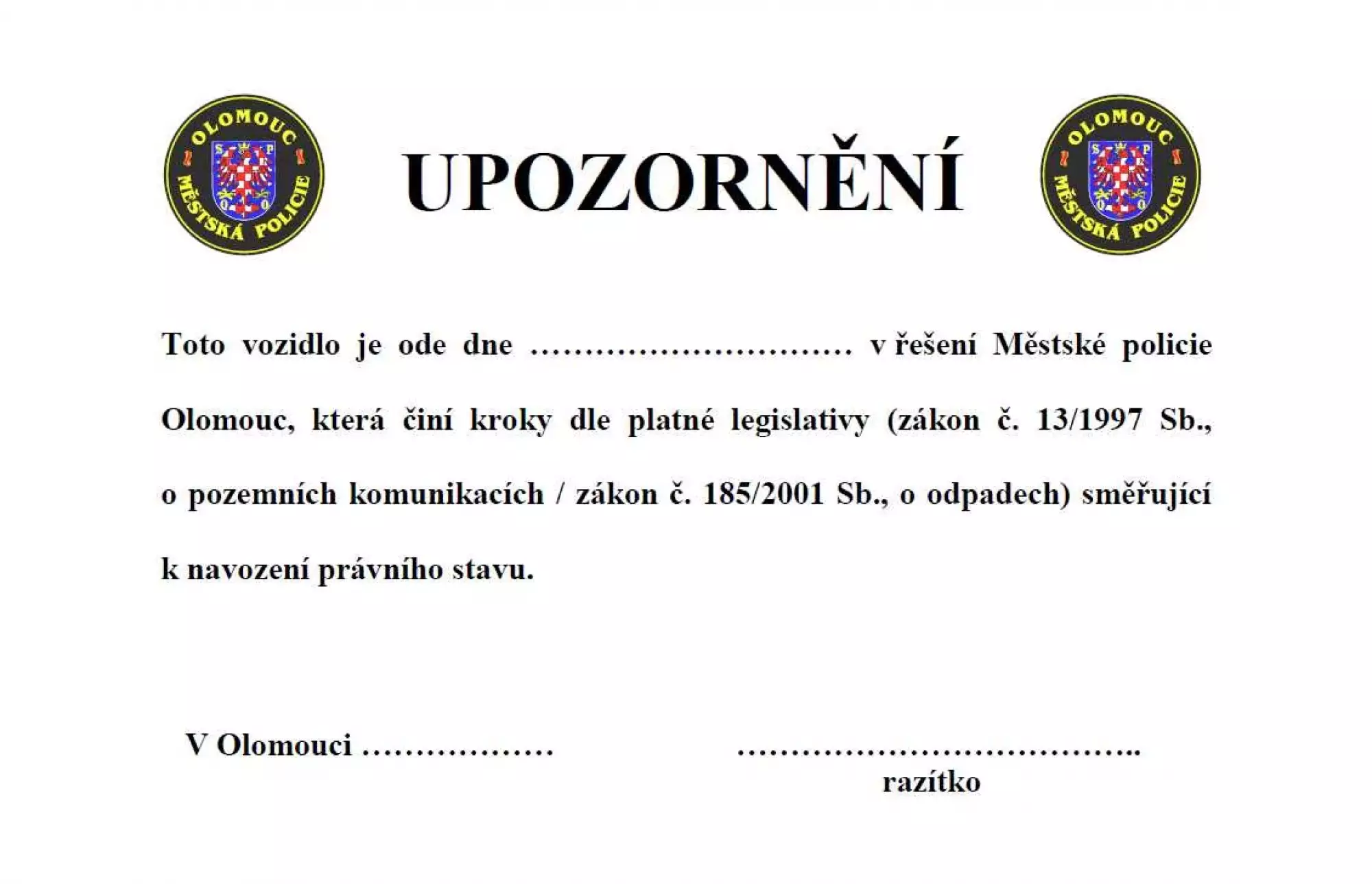 Městská policie na odstavené vozidlo umístí upozornění o tom, že jsou v této věci činěny legislativní kroky (tj. oznámení přestupku příslušnému správnímu orgánu, který je oprávněn činit úkony směřující k odstranění odstaveného vozidla).