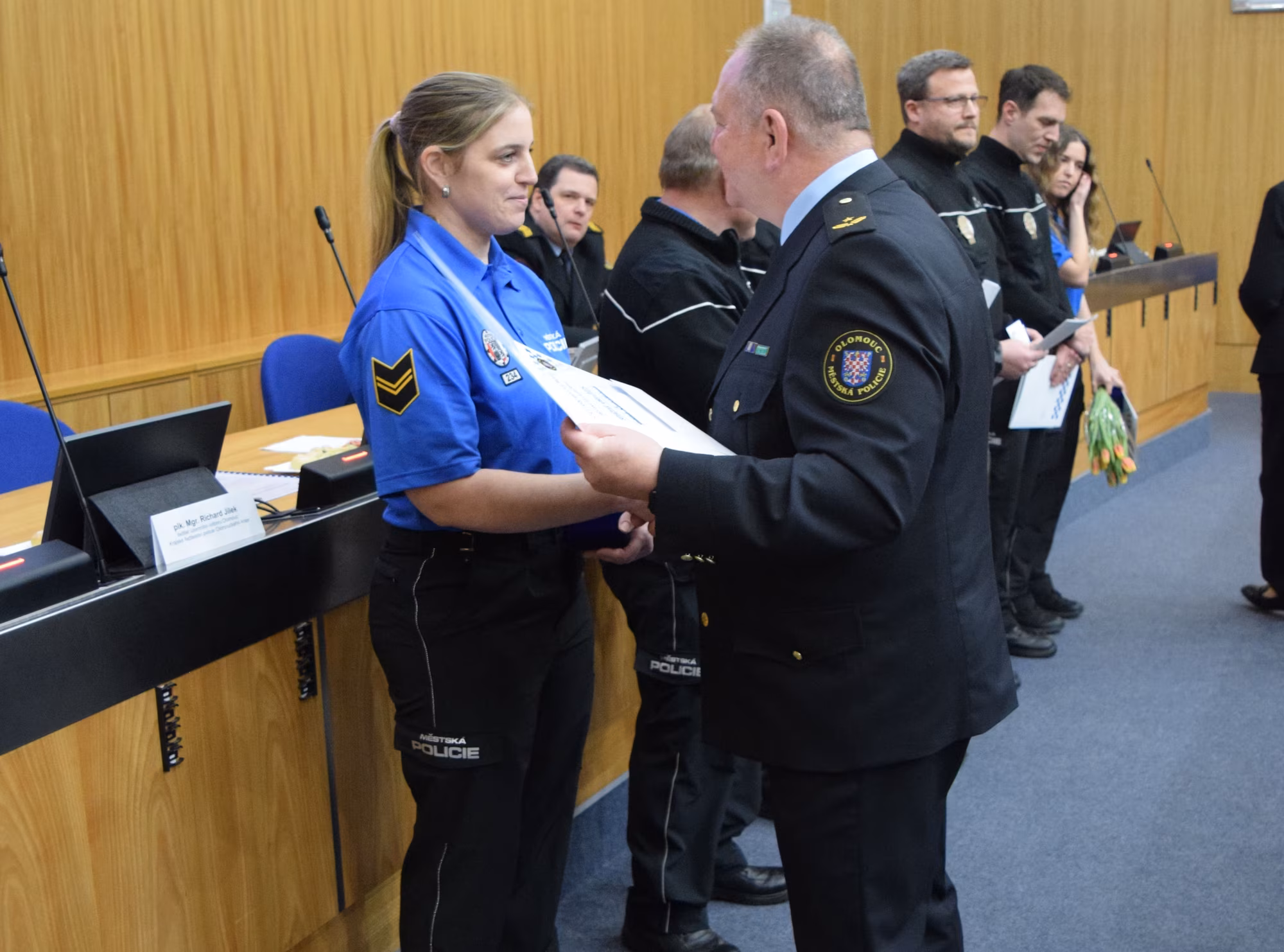 Na samotný konec výročního shromáždění byly předány Čestné medaile ředitele Městské policie Olomouc za zásluhy, kterou obdržela Mgr. Magda Václavíkova z oddělení dopravní služby a ostrahy za dlouholetý mimořádný přínos a obětavou práci v letech 2001 – 2025. A poté následovalo udělení stejného ocenění Mgr. Štefanu Horváthovi, který pracuje u městské policie jako civilní zaměstnanec a ten byl oceněn za svoji práci za období let 1995 až 2025.