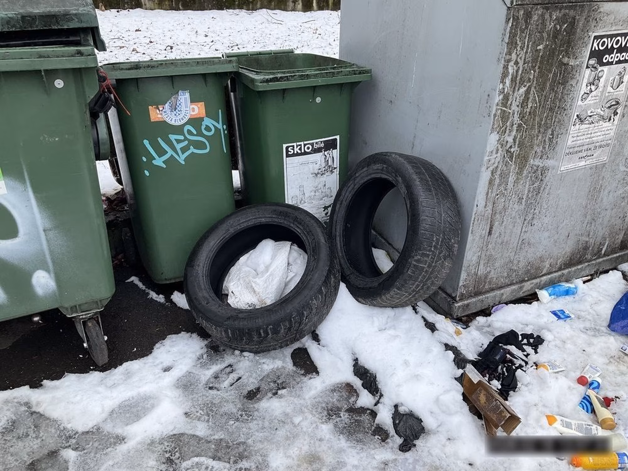 Staré pneumatiky nechal u kontejneru