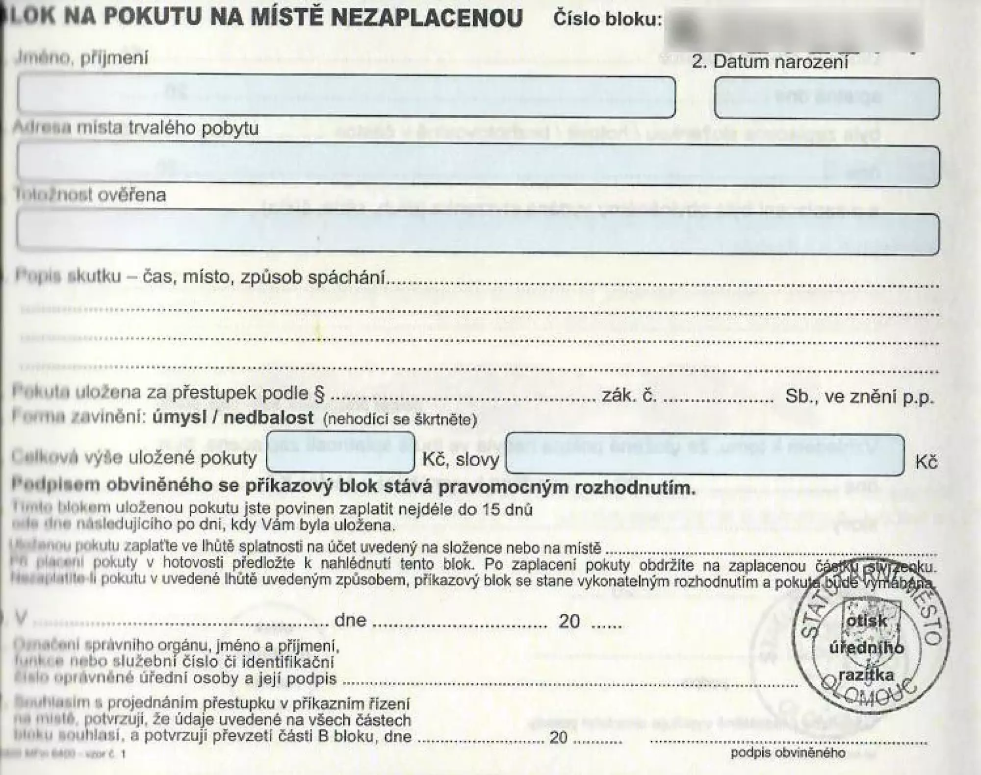 V případě příkazového bloku na peněžitou povinnost na místě nezaplacenou vydaného Městskou policií Olomouc lze tuto pokutu uhradit do 15-ti dnů.