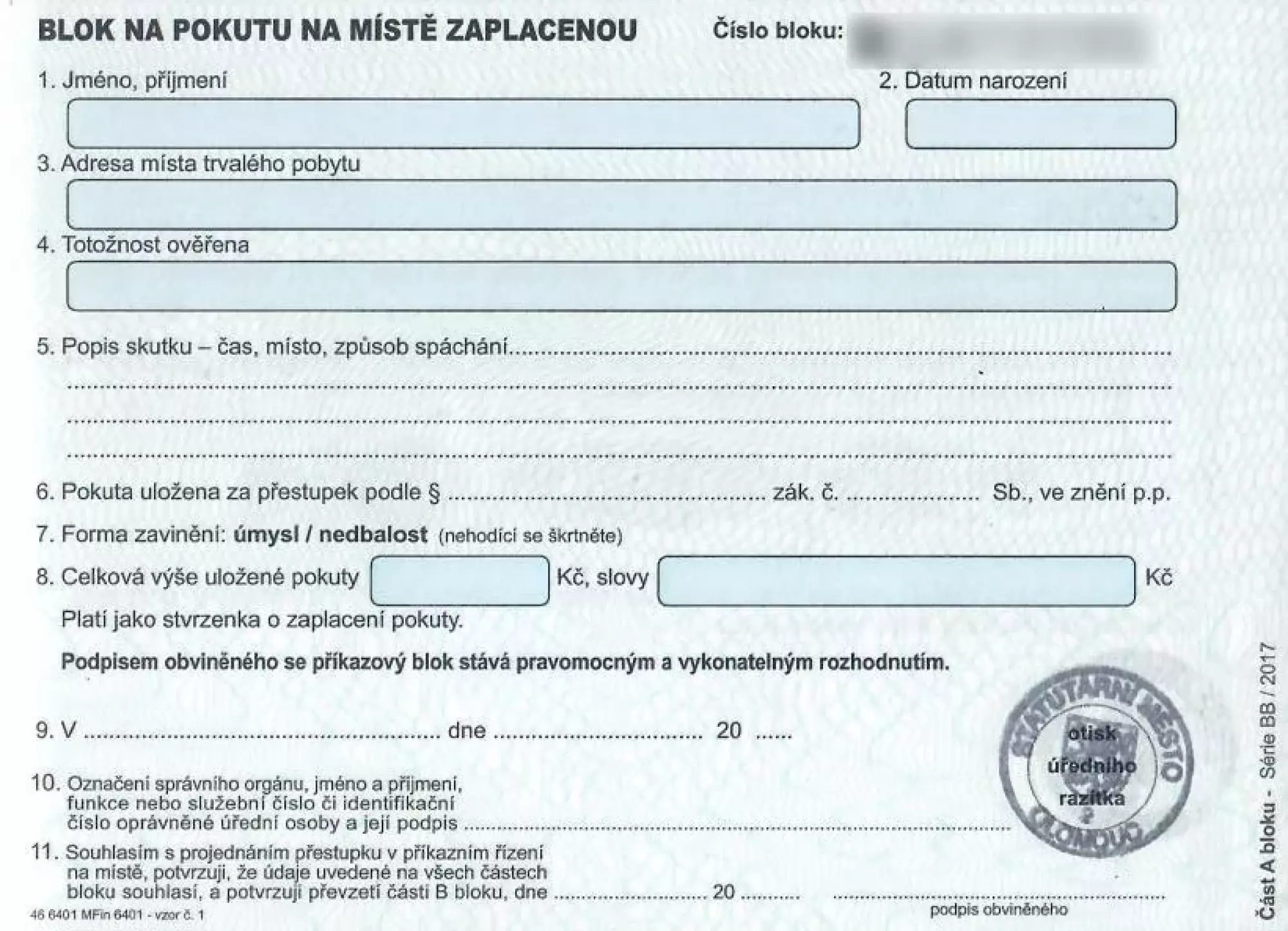 - blok na pokutu na místě nezaplacenou nebo upozornění pro nepřítomného řidiče podezřelého ze spáchání přestupku,