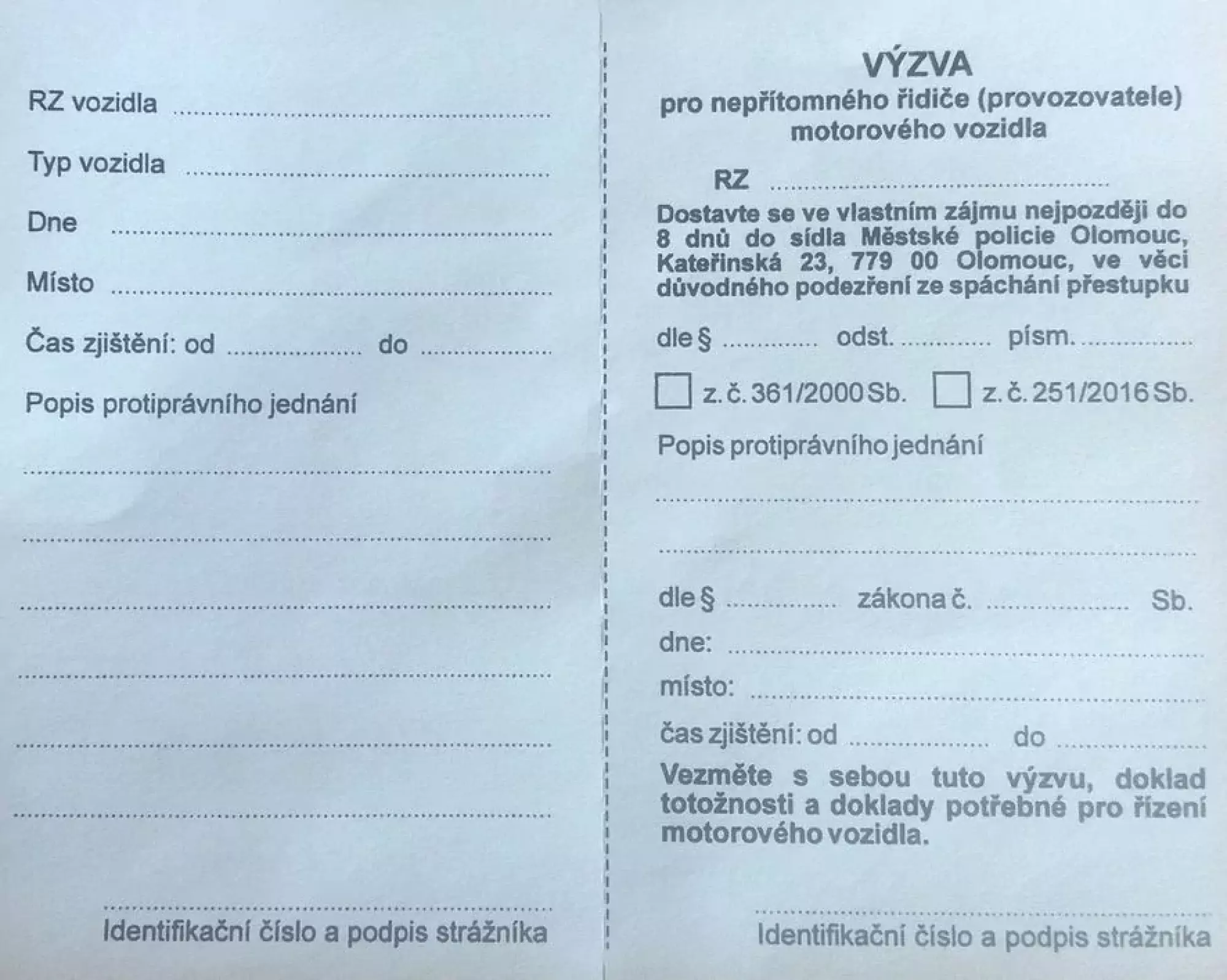 UPOZORNĚNÍ PRO NEPŘÍTOMNÉHO ŘIDIČE PODEZŘELÉHO ZE SPÁCHÁNÍ PŘESTUPKU SE UMÍSTÍ NA VOZIDLO, kdy toto upozornění obsahuje: